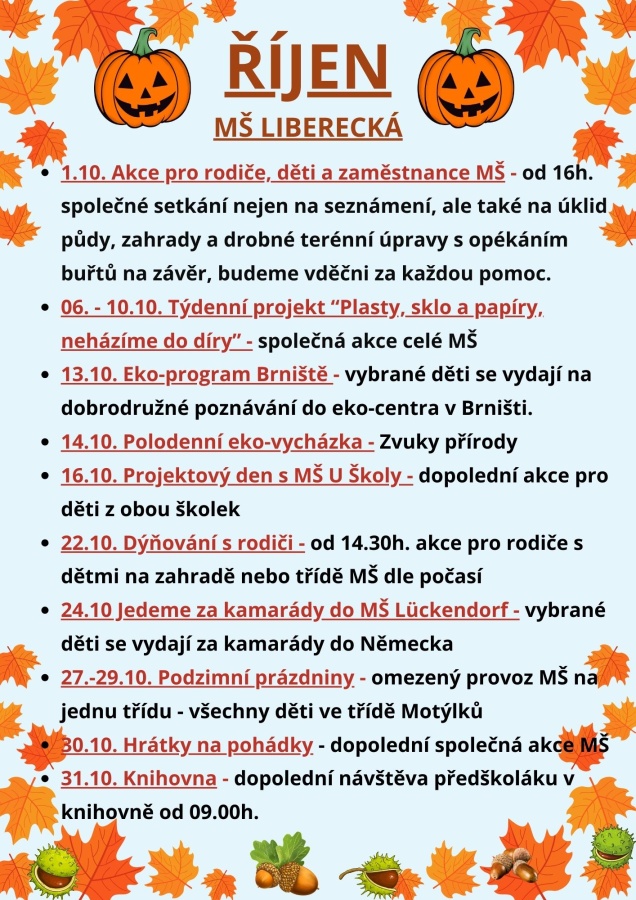 01.10. Akce pro rodiče, děti a zaměstnance MŠ - od 16 h. společné setkání nejen na seznámení, ale také na úklid půdy, zahrady a drobné terénní úpravy s opékáním buřtů na závěr, budeme vděčni za každou pomoc.