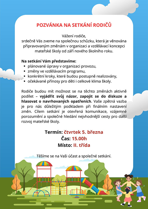 srdečně Vás zveme na společnou schůzku, která je věnována připravovaným změnám v organizaci a vzdělávací koncepci mateřské školy od září nového školního roku.