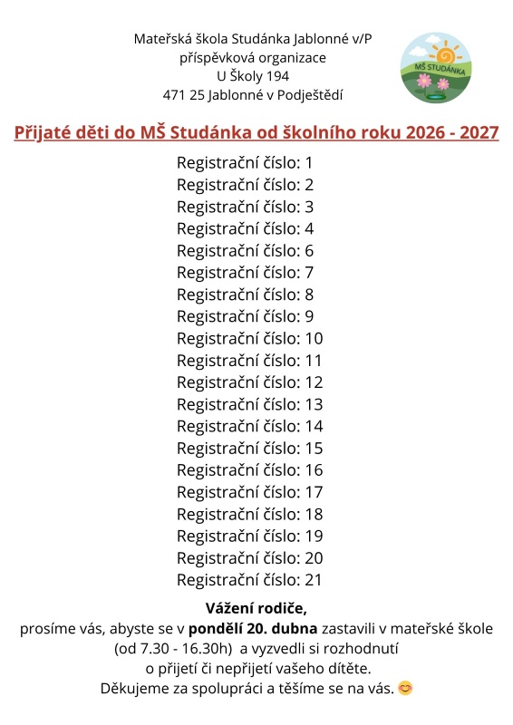 prosíme vás, abyste se v pondělí 20. dubna zastavili v mateřské škole (od 7.30 - 16.30 h) a vyzvedli si rozhodnutí o přijetí či nepřijetí vašeho dítěte. Děkujeme za spolupráci a těšíme se na vás.