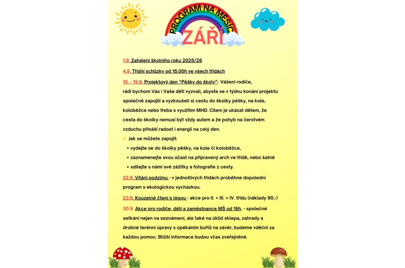 30.9. Akce gro rodiče, děti a zaměstnance MŠ od 16h. - společné setkání nejen na seznámení, ale také na úklid sklepa, zahrady a drobné terénní úpravy s opékáním buřtů na závěr, budeme vděčni za každou pomoc. Bližší informace budou včas zveřejněné.