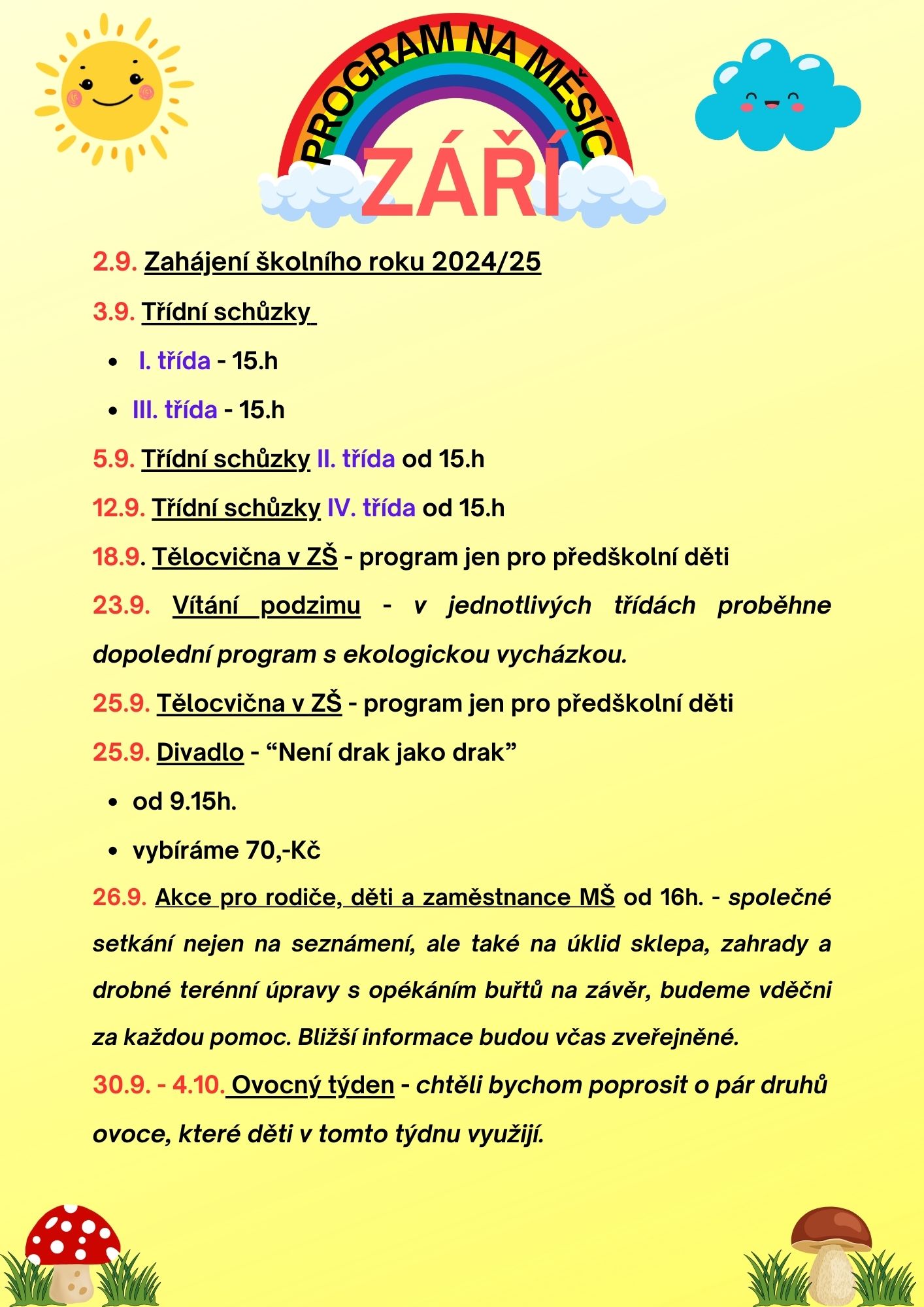 23. 9. Vítání podzimu - v jednotlivých třídách proběhne dopolední program s ekologickou vycházkou.