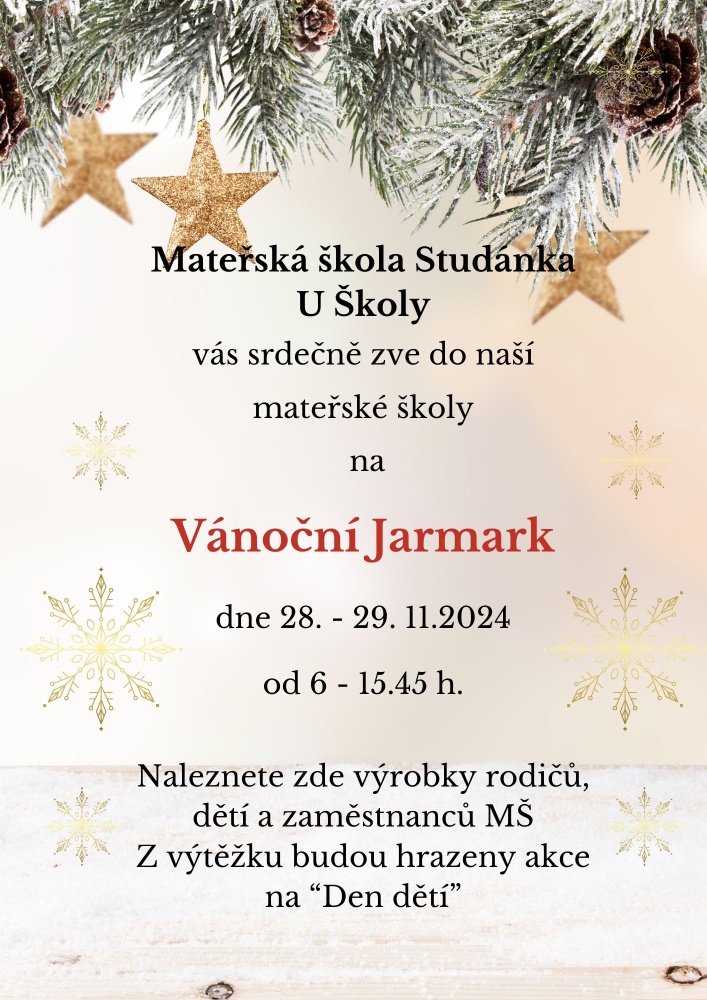 28. - 29. 11. Vánoční jarmark na chodbě MŠ - 6.00 -15.45 hodin. Bude připravena prodejní výstavka vánočních výrobků dětí, rodičů a personálu.