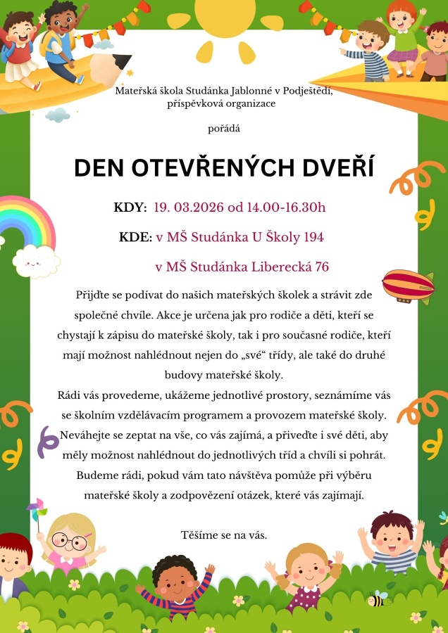 Mateřská škola Studánka Jablonné v Podještědí, příspěvková organizace pořádá